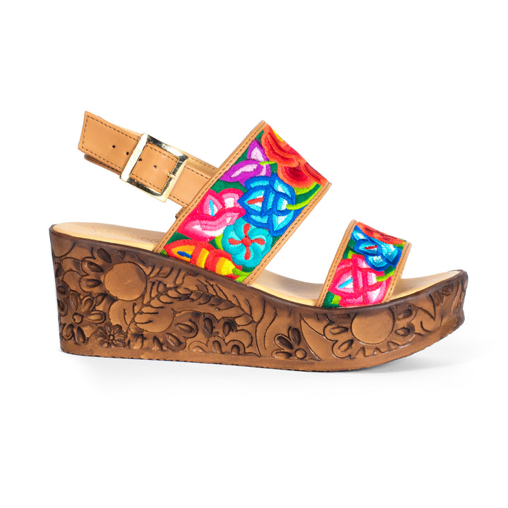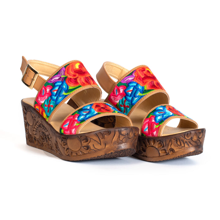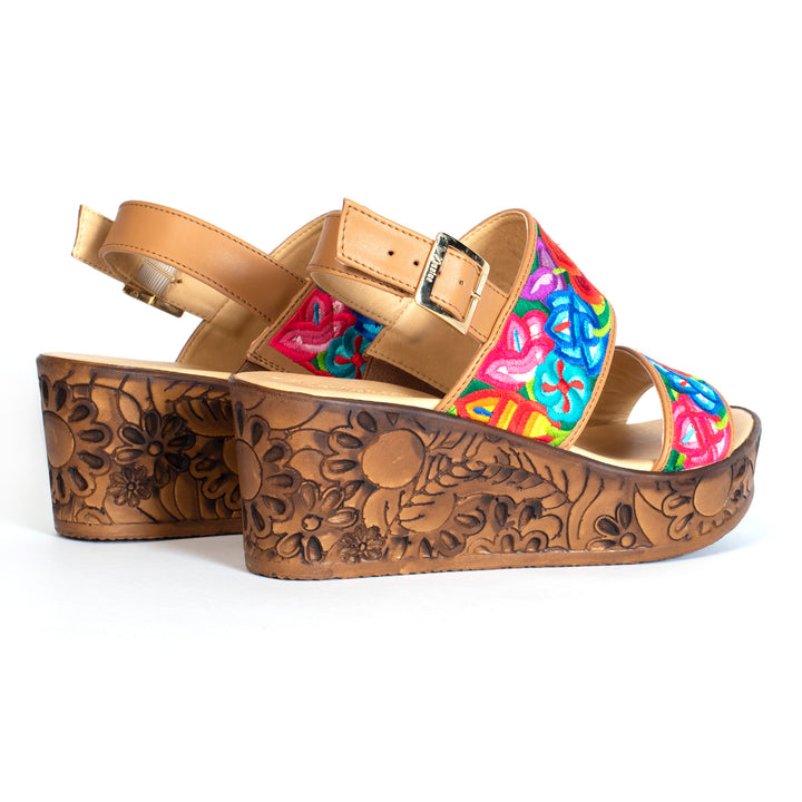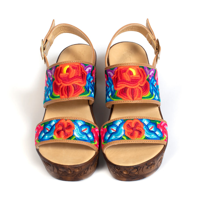 Calzado fabricado con acabados en piel, su original diseño se caracteriza por flores teñidas en colores llamativos inspiradas en el folklore y cultura de la region de Oaxaca