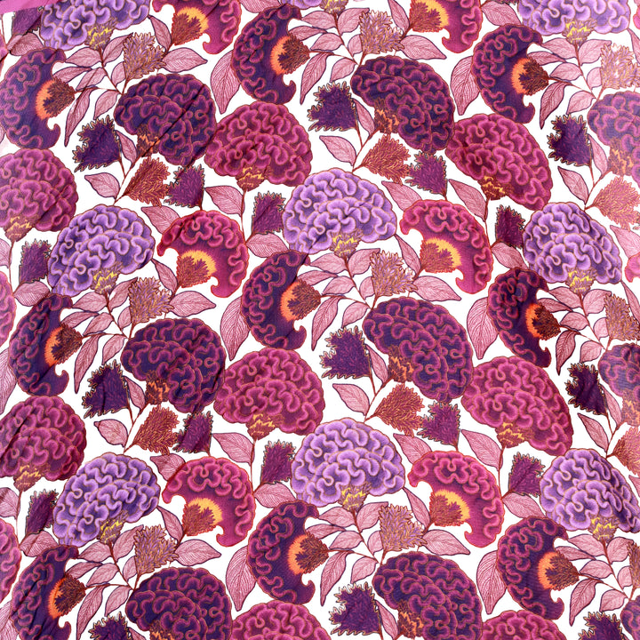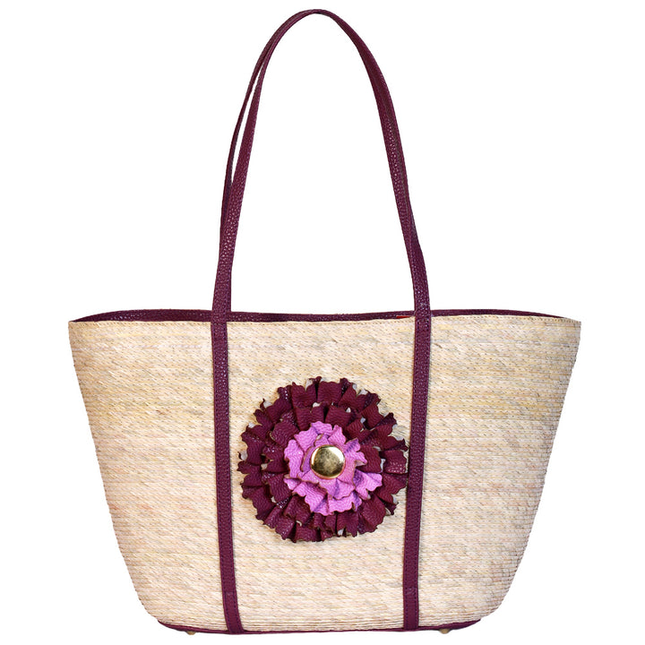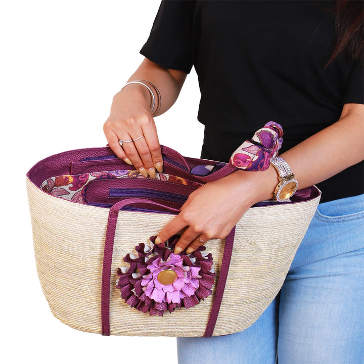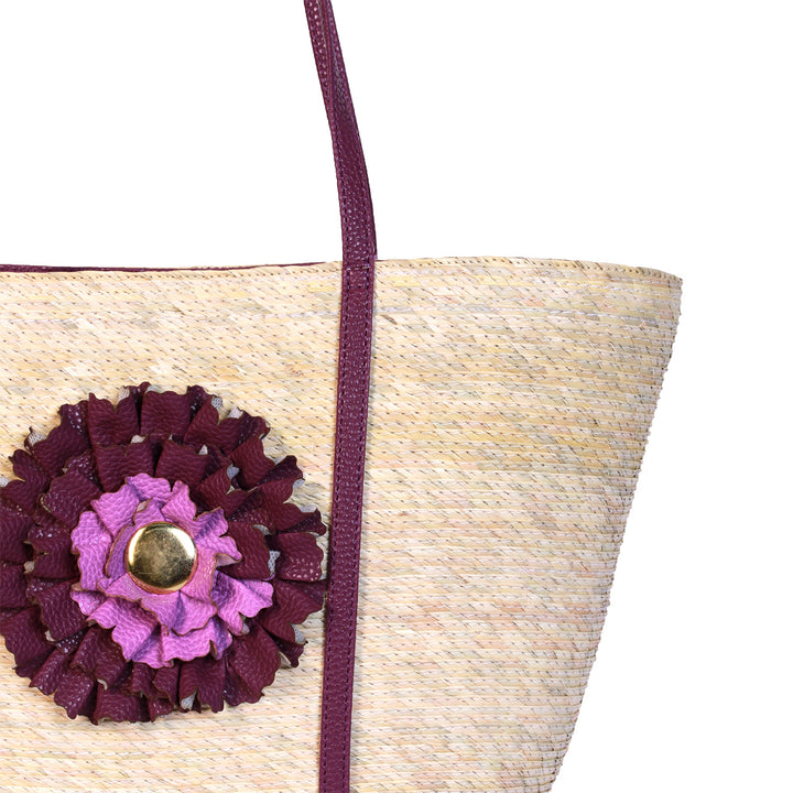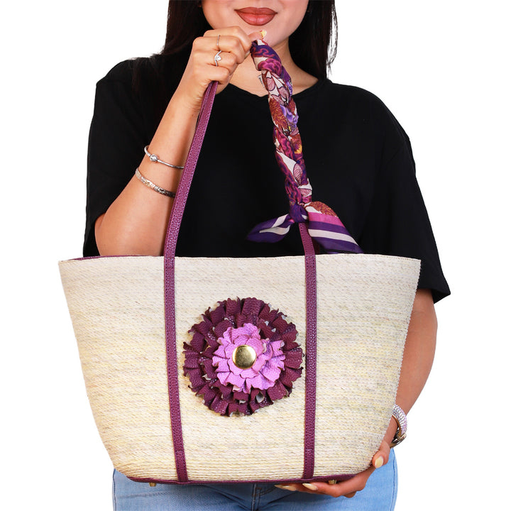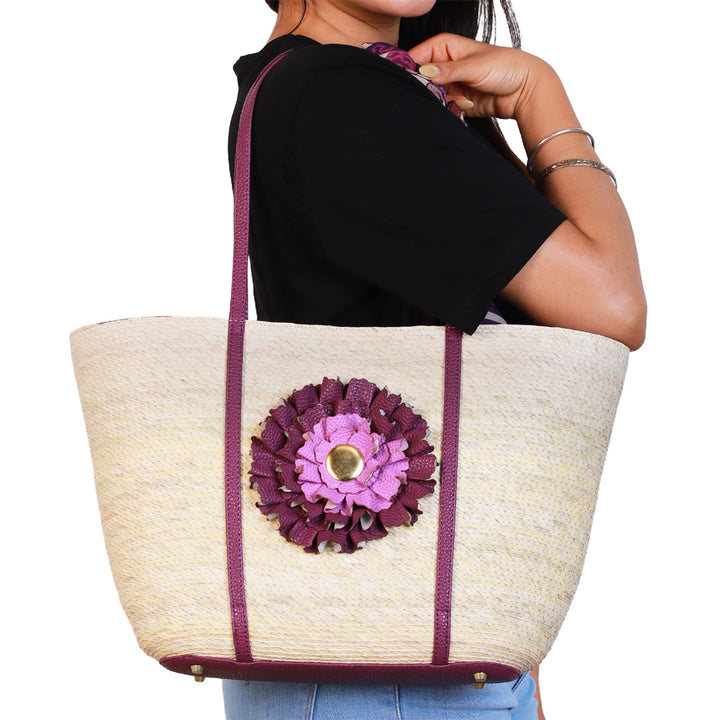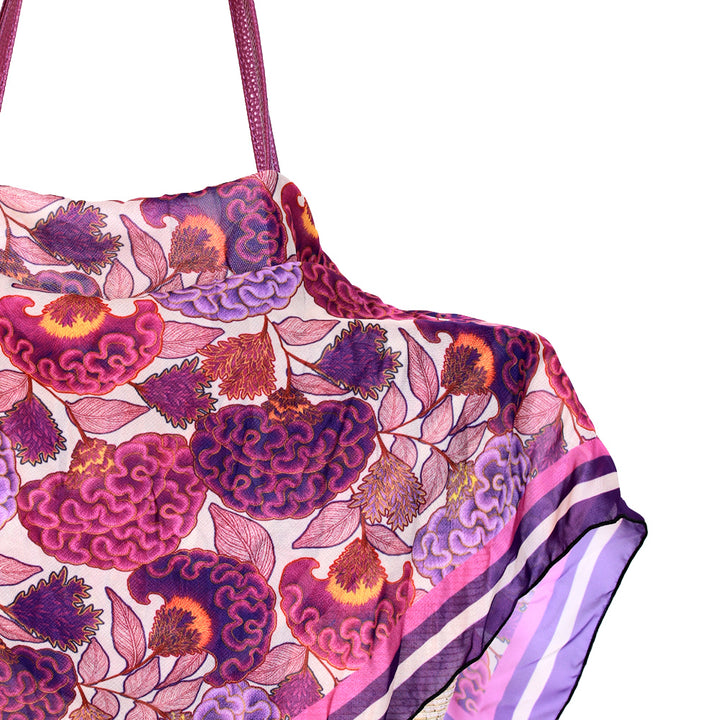 Diseño con flor inspirada en la cresta de gallo, en tonos lilas y violetas que evocan la armonía y elegancia de los colores oaxaqueños. Incluye mascada decorativa de regalo, ideal para complementar un estilo fresco y artesanal con un toque moderno.