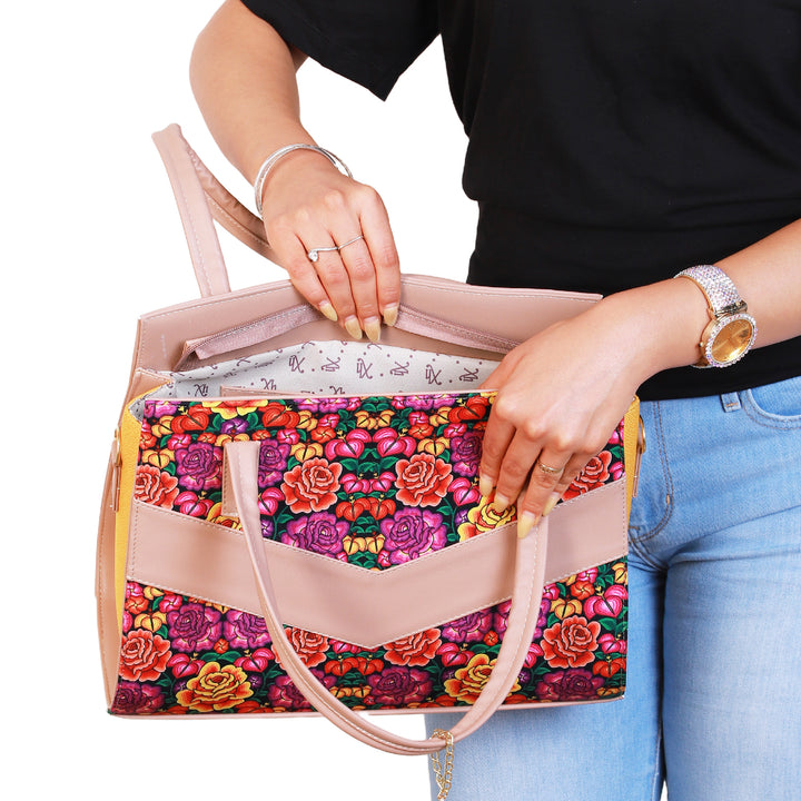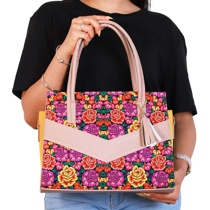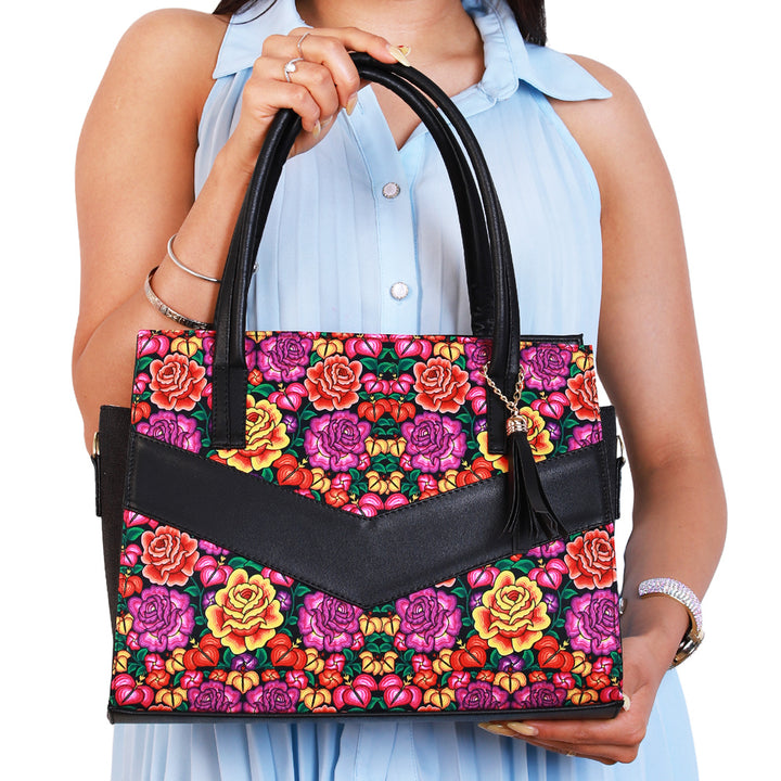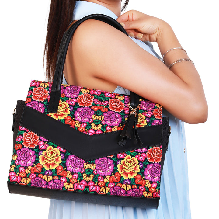 Diseño con motivo de flores en tonos vibrantes que resaltan sobre el fondo oscuro, aportando un estilo elegante y moderno. Confeccionada en piel, ofrece durabilidad, amplitud y un toque distintivo ideal para cualquier ocasión.